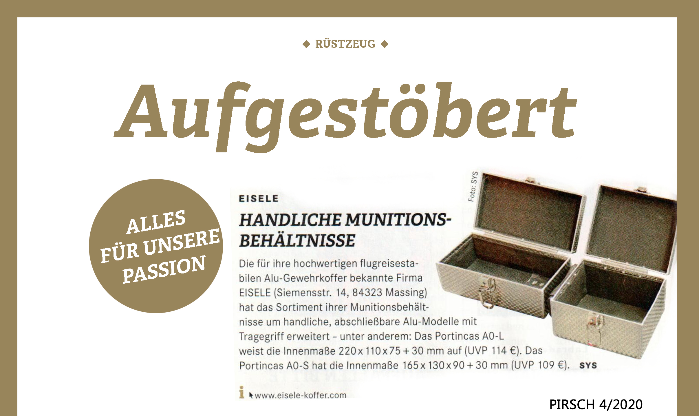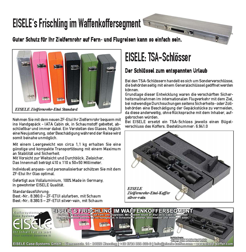 Die für Ihre hochwertigen flugreisestabilen Alu-Gewehrkoffer bekannte Firma EISELE (Siemensstr. 14, 84323 Massing) hat das Sortiment ihrer Munitionsbehältnisse um handliche, abschließbare Alu-Modelle mit Tragegriff erweitert - unter anderem: Das Portincas A 0-L weist die Innenmaße 220 x 110 x 75+30 mm auf (UVP 114,- €). Das Portincas A 0-S hat die Innenmaße 165 x 130 x 90+30 mm (UVP 109,- €).
