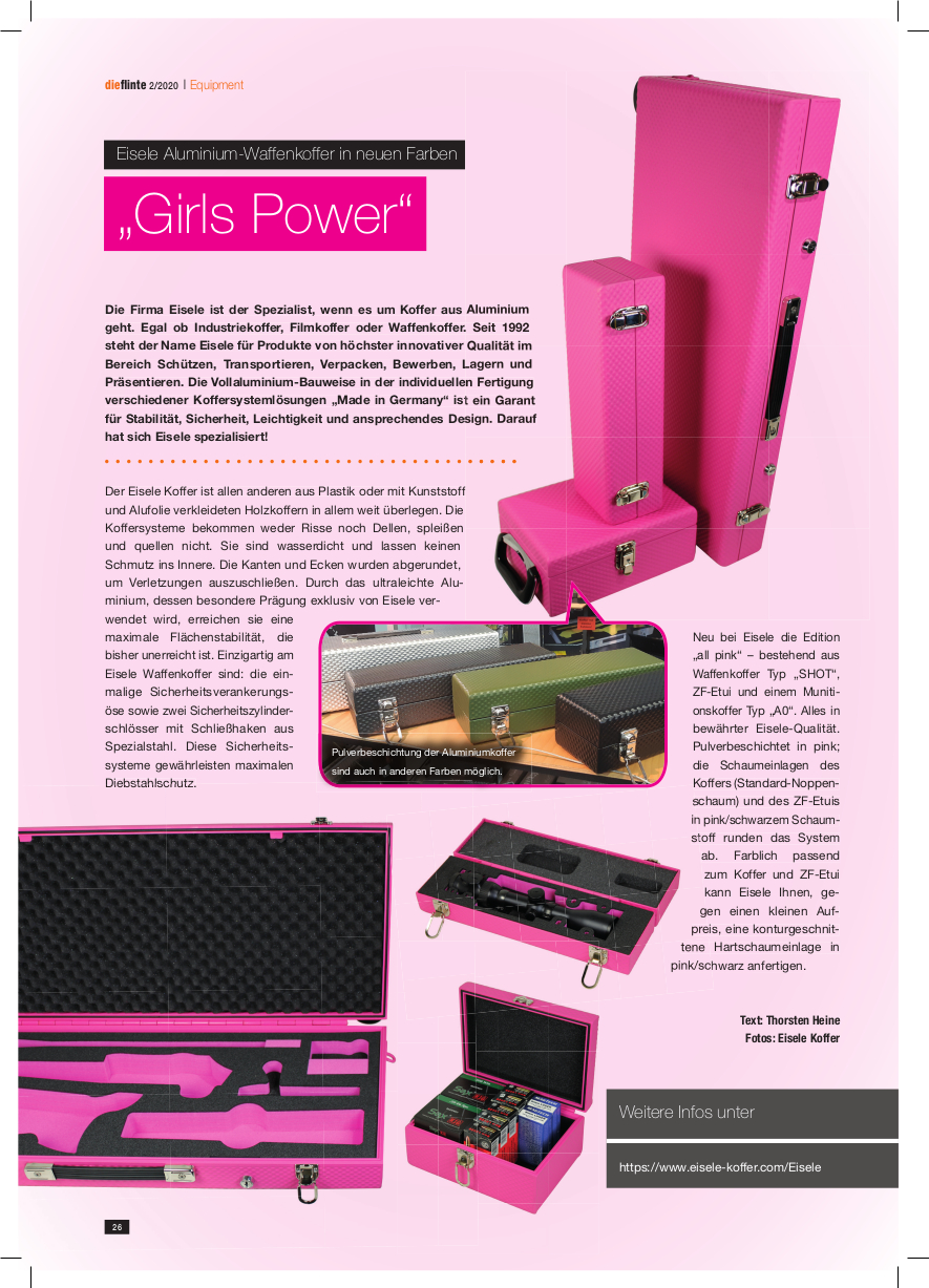 Neu bei Eisele die Edition „all pink“ – bestehend aus Waffenkoffer Typ „SHOT“, ZF-Etui und einem Munitionskoffer Typ „A0“. Alles in bewährter Eisele-Qualität. Pulverbeschichtet in pink; die Schaumeinlagen des Koffers (Standard-Noppenschaum) in pink/schwarzem Schaumstoff runden das System ab. Farblich passend zum Koffer und ZF-Etui kann Eisele Ihnen, gegen einen kleinen Aufpreis, eine konturgeschnittene Hartschaumeinlage in pink/schwarz anfertigen.