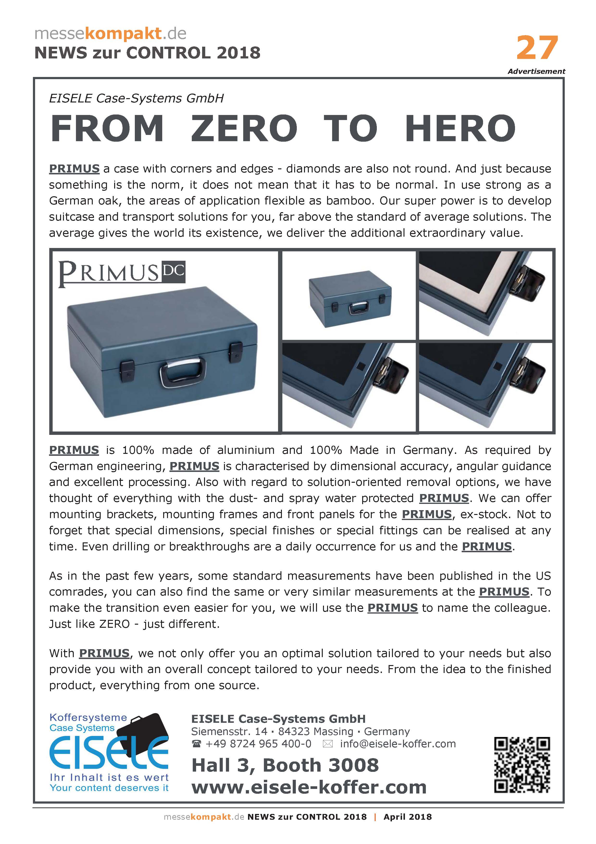Die Firma Eisele ist der Spezialist, wenn es um Koffer aus Aluminium geht. Egal ob Industriekoffer, Filmkoffer oder Waffenkoffer. Seit 1992 steht der Name Eisele für Produkte von höchster Innovativer Qualität im Bereich Schützen, Transportieren, Ver packen, Bewerben, Lagern und Präsentieren. Die Vollaluminium-Bauweise in der individuellen Fertigung verschiedener Koffersystemlösungen „Made in Germany“ ist ein Garant für Stabilität, Sicherheit, Leichtigkeit und ansprechendes Design. Darauf hat sich Eisele spezialisiert!